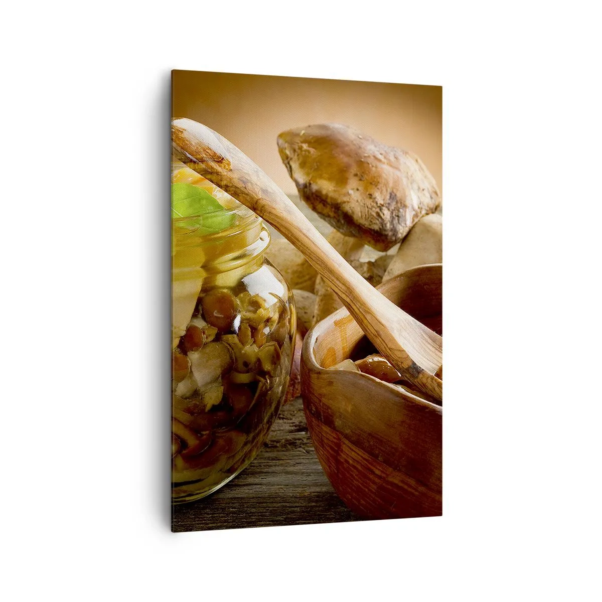 Impression sur toile - Image sur toile - Champignons naturels dans un bocal sur une table rustique - 80x120cm - Que ce soit frais ou salé, ou en automne... - Décoration murale moderne pour le salon et la chambre ARTTOR
