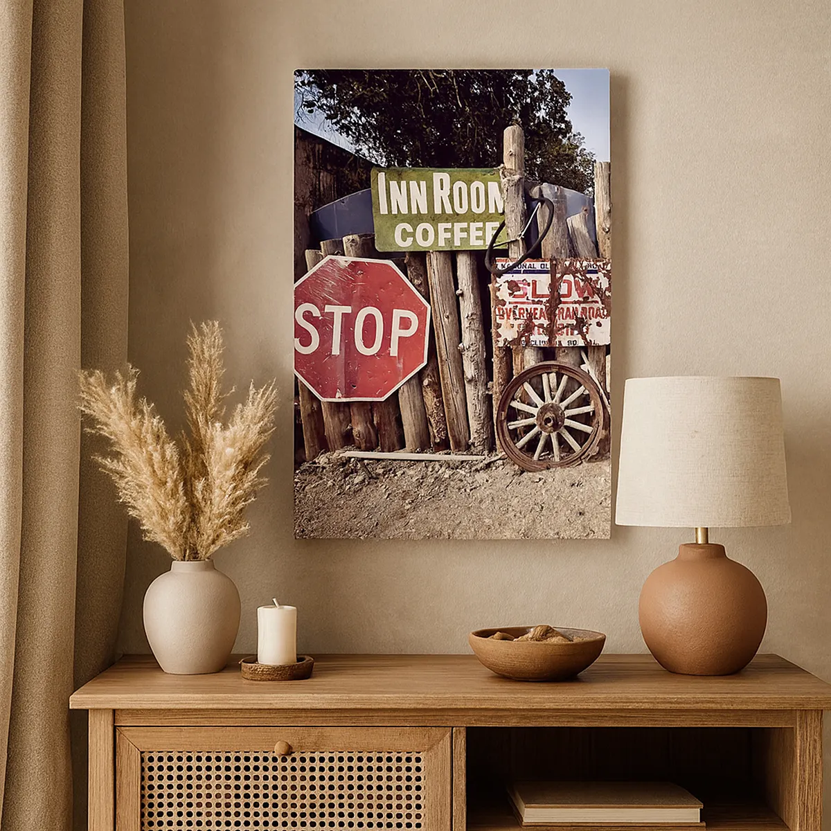 Impression sur toile - Image sur toile - Décorations rustiques avec des panneaux et une roue sur la clôture - 50x70cm - Et le temps s'est arrêté - Décoration murale moderne pour le salon et la chambre ARTTOR