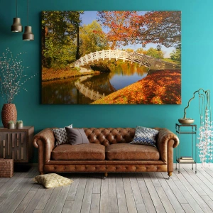 Impression sur toile - Image sur toile - Un pont dans un parc entouré de feuilles d'automne sur une eau calme - 50x70cm - Sur le pont blanc des soupirs - Décoration murale moderne pour le salon et la chambre ARTTOR
