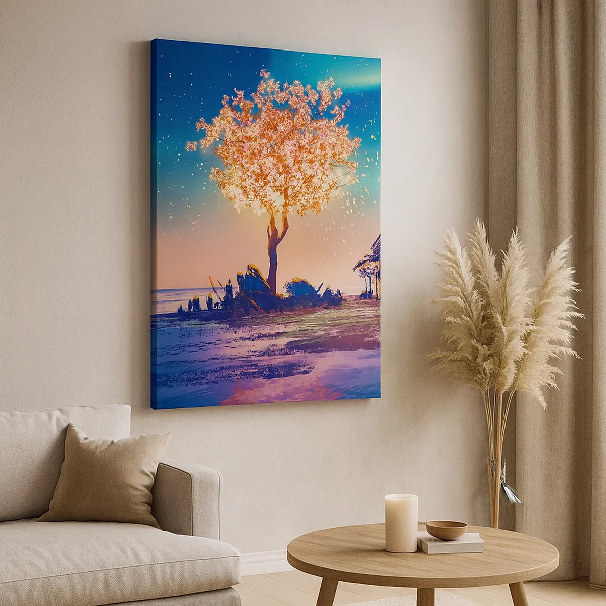 Impression sur toile - Image sur toile - Une maison et un arbre en fleurs sous le ciel nocturne - 50x70cm - La nature ne passe pas - Décoration murale moderne pour le salon et la chambre ARTTOR