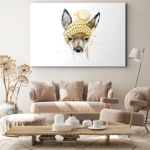 Impression sur toile - Image sur toile - Cerf aquarelle avec une casquette jaune - 50x70cm - Pour l'hiver dans la forêt enneigée - Décoration murale moderne pour le salon et la chambre ARTTOR