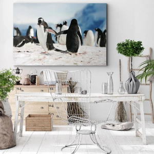 Impression sur toile - Image sur toile - Un groupe de pingouins dans la neige dans un paysage antarctique - 50x70cm - Danser dans la neige - Décoration murale moderne pour le salon et la chambre ARTTOR