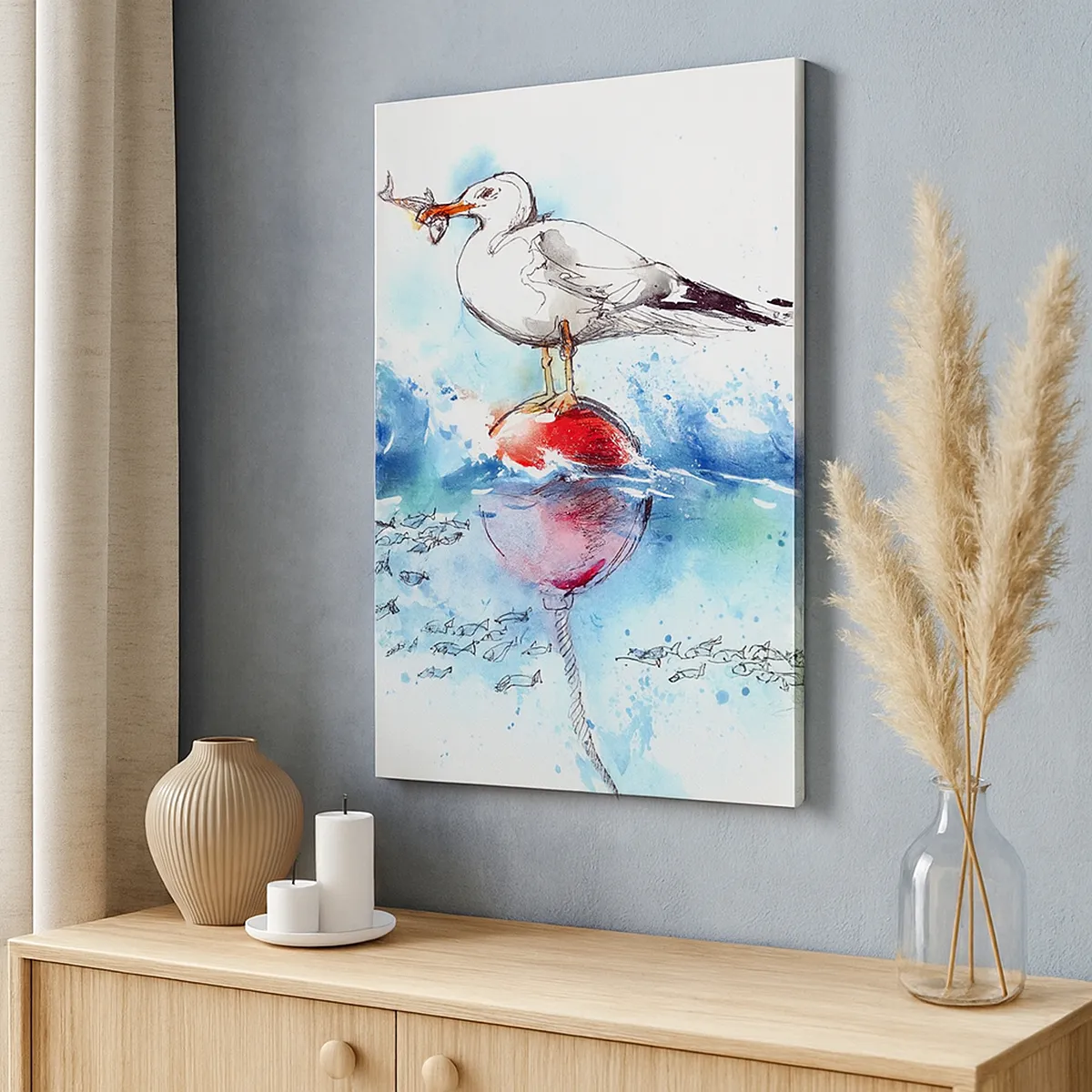 Impression sur toile - Image sur toile - Mouette sur une bouée avec des poissons en arrière-plan dans un style aquarelle - 50x70cm - Prise réussie - Décoration murale moderne pour le salon et la chambre ARTTOR