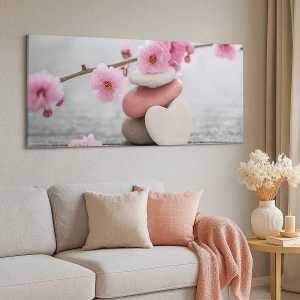 Impression sur toile - Image sur toile - Fleurs de cerisier délicates avec des pierres en forme de cœur - 50x70cm - Le bonheur avec une fleur de cerisier - Décoration murale moderne pour le salon et la chambre ARTTOR