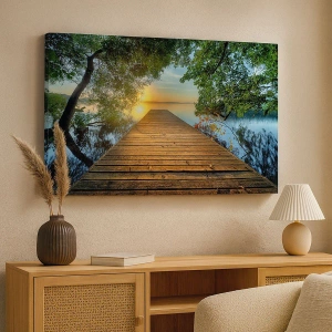 Impression sur toile - Image sur toile - Une jetée en bois entourée de verdure au coucher du soleil - 80x120cm - Prenez votre temps, asseyez-vous - Décoration murale moderne pour le salon et la chambre ARTTOR