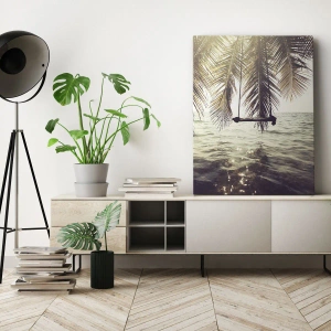 Impression sur toile - Image sur toile - Palmier avec une balançoire au-dessus de l'eau au soleil - 80x120cm - Vous pouvez vous balancer dans les nuages