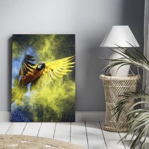 Impression sur toile - Image sur toile - Un perroquet en vol sur fond d'explosions colorées de jaune et de bleu. - 50x70cm - Dans la poussière bleue et dorée - Décoration murale moderne pour le salon et la chambre ARTTOR