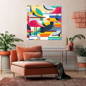 Impression sur toile - Image sur toile - Oiseaux colorés dans une composition abstraite et géométrique - 50x70cm - Fête des oiseaux - Décoration murale moderne pour le salon et la chambre ARTTOR