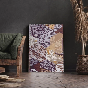 Impression sur toile - Image sur toile - Un motif décoratif de feuilles tropicales dans des tons de violet, d'orange et de beige. - 50x70cm - Relation impossible entre la géométrie et la nature - Décoration murale moderne pour le salon et la chambre ARTTO