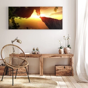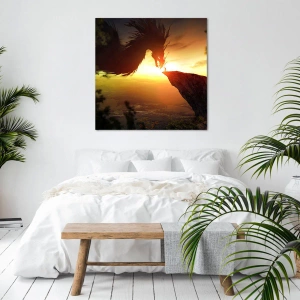 Impression sur toile - Image sur toile - Un dragon et un homme sur un rocher dans la lueur du soleil couchant - 50x70cm - Chasseur de dragon - Décoration murale moderne pour le salon et la chambre ARTTOR