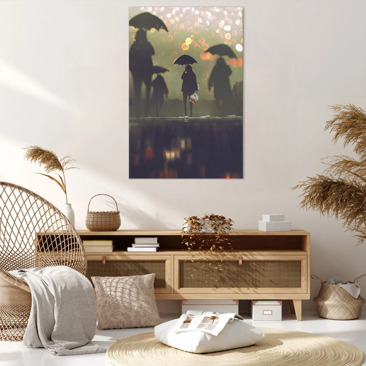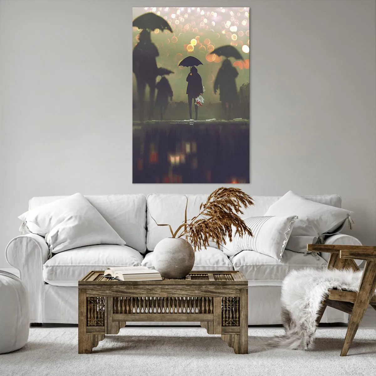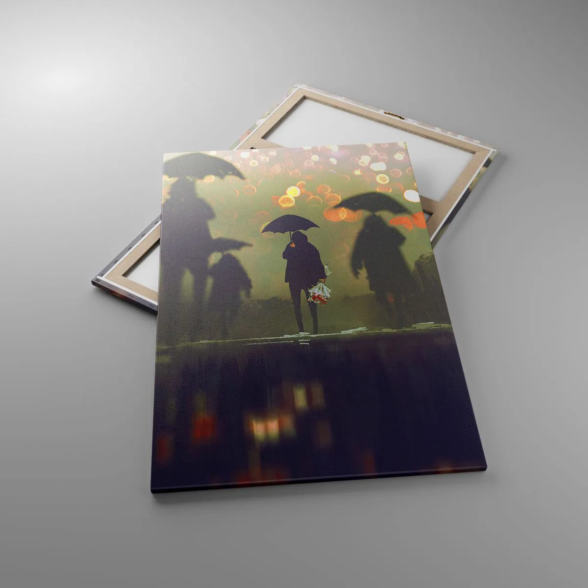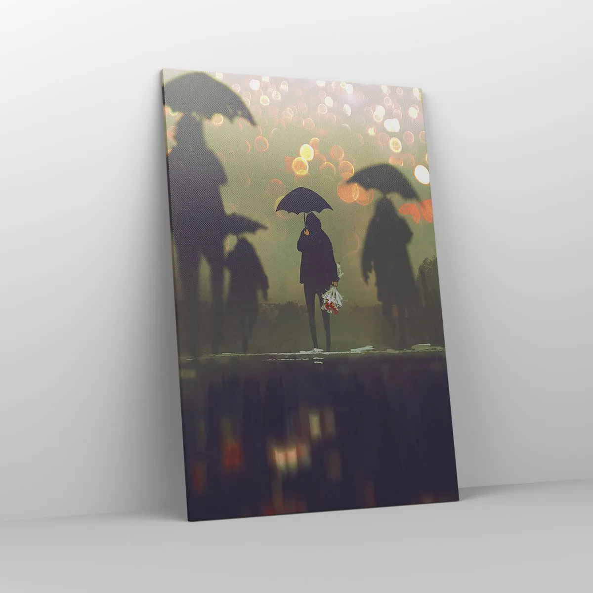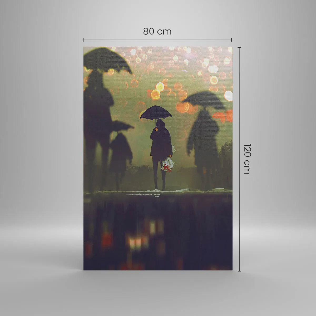 Impression sur toile - Image sur toile - Une silhouette avec un parapluie un soir pluvieux parmi les lumières de la ville - 80x120cm - Du point de vue d'une goutte de pluie - Décoration murale moderne pour le salon et la chambre ARTTOR