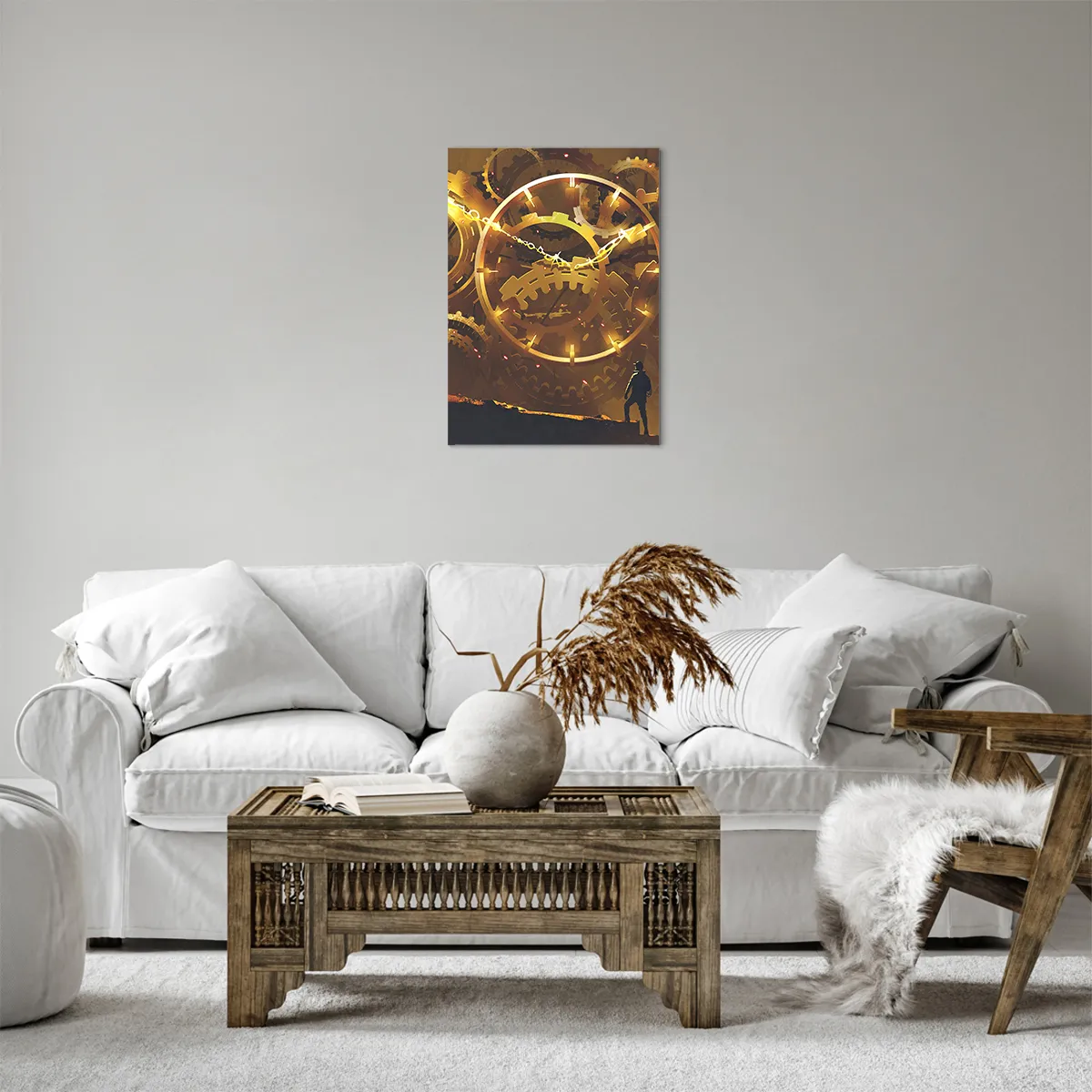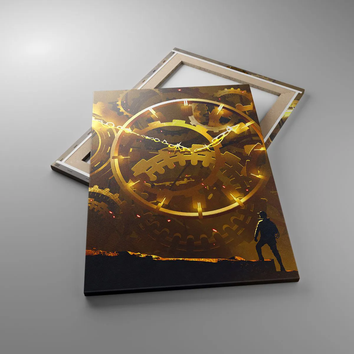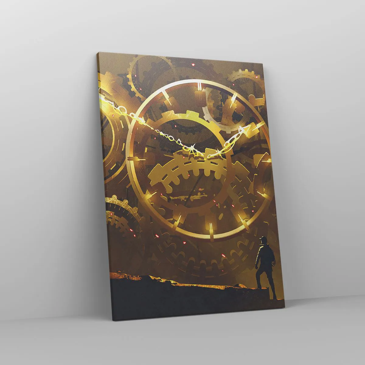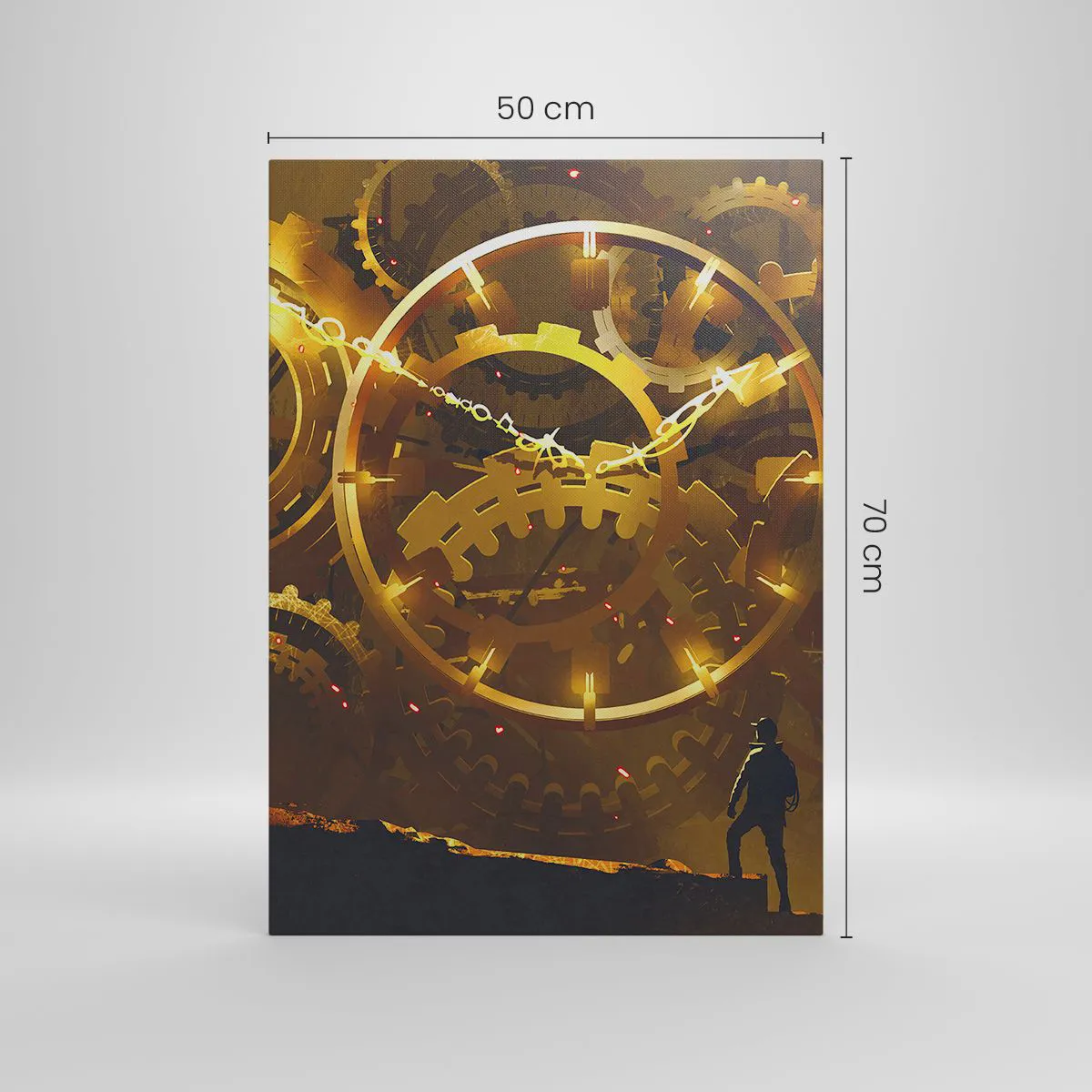 Impression sur toile - Image sur toile - Engrenages dorés dans un décor surréaliste avec une figurine - 50x70cm - À la source du temps - Décoration murale moderne pour le salon et la chambre ARTTOR
