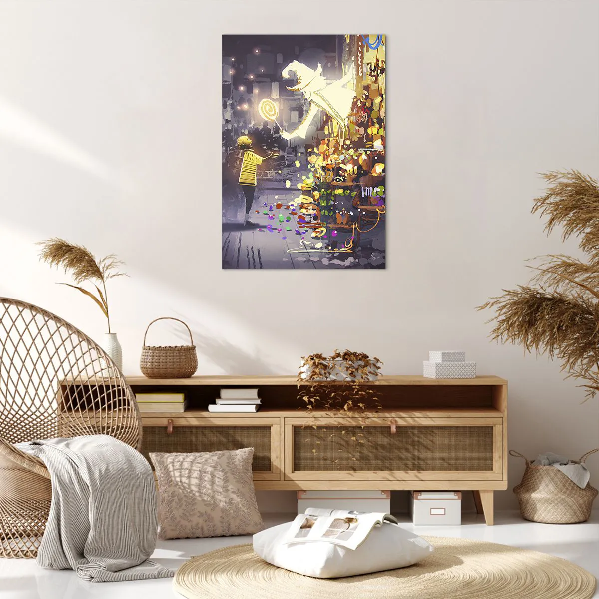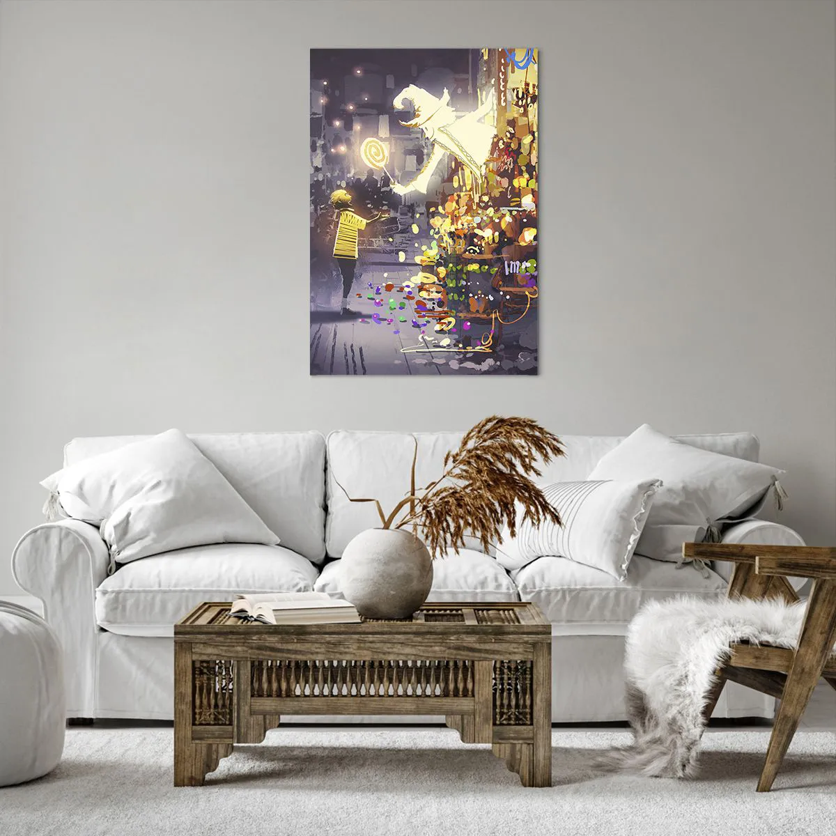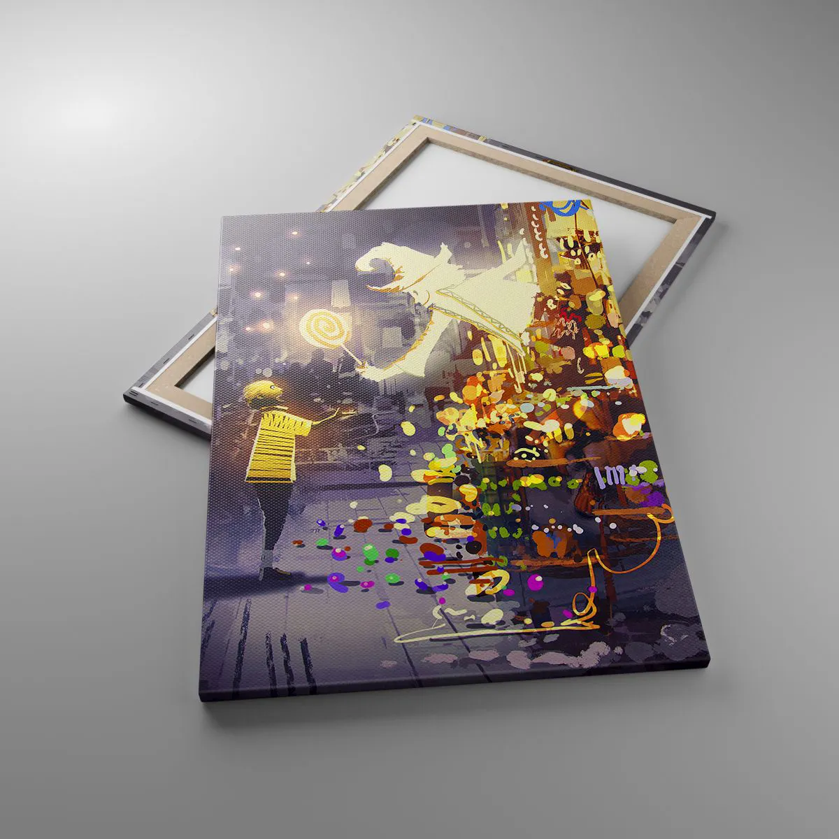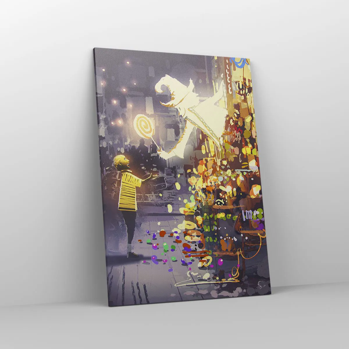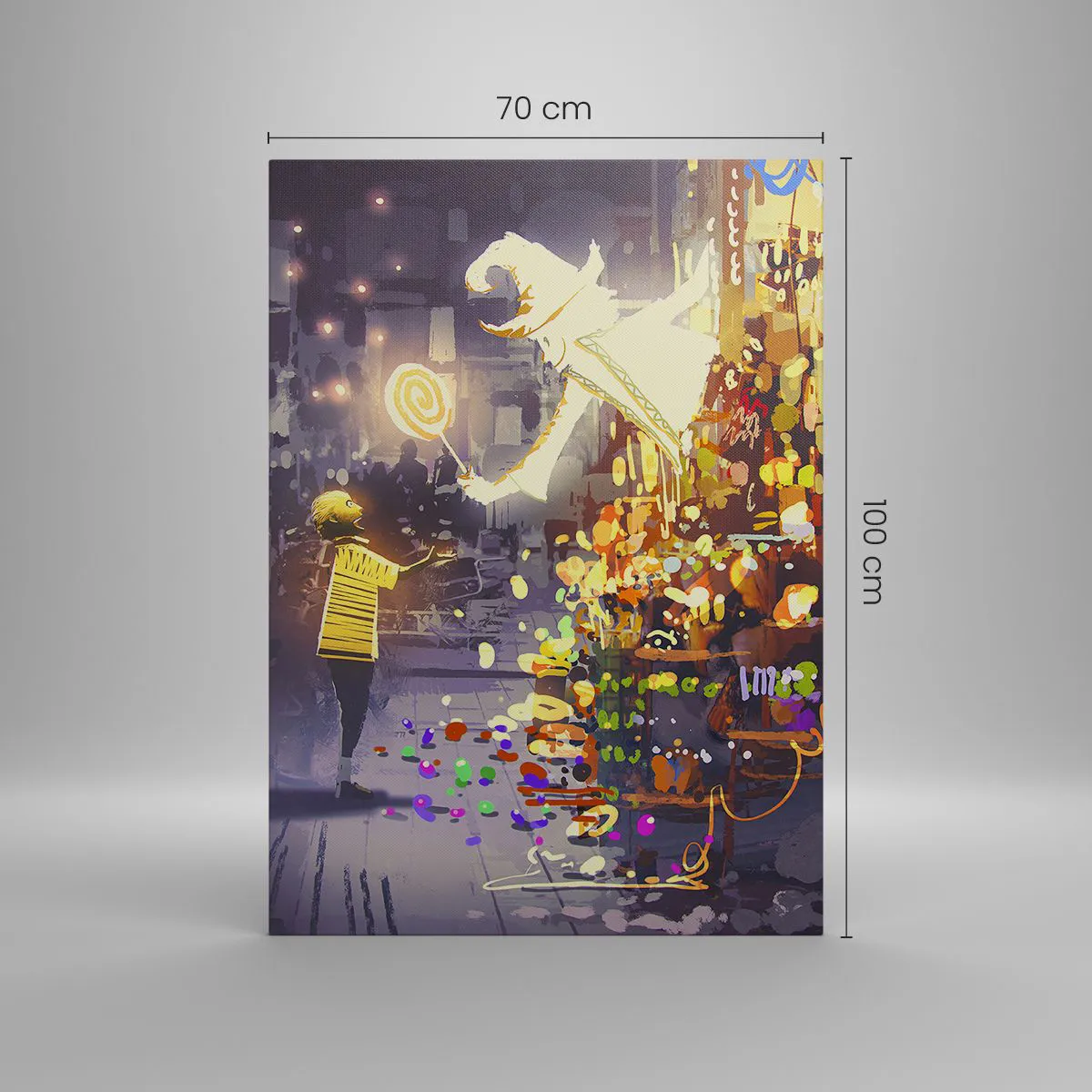 Impression sur toile - Image sur toile - Un personnage de conte de fées et un enfant dans une rue pleine de lumières et de magie - 70x100cm - La magie existe - Décoration murale moderne pour le salon et la chambre ARTTOR