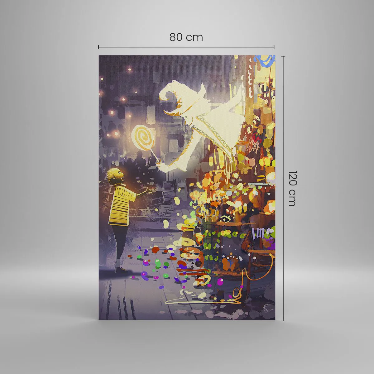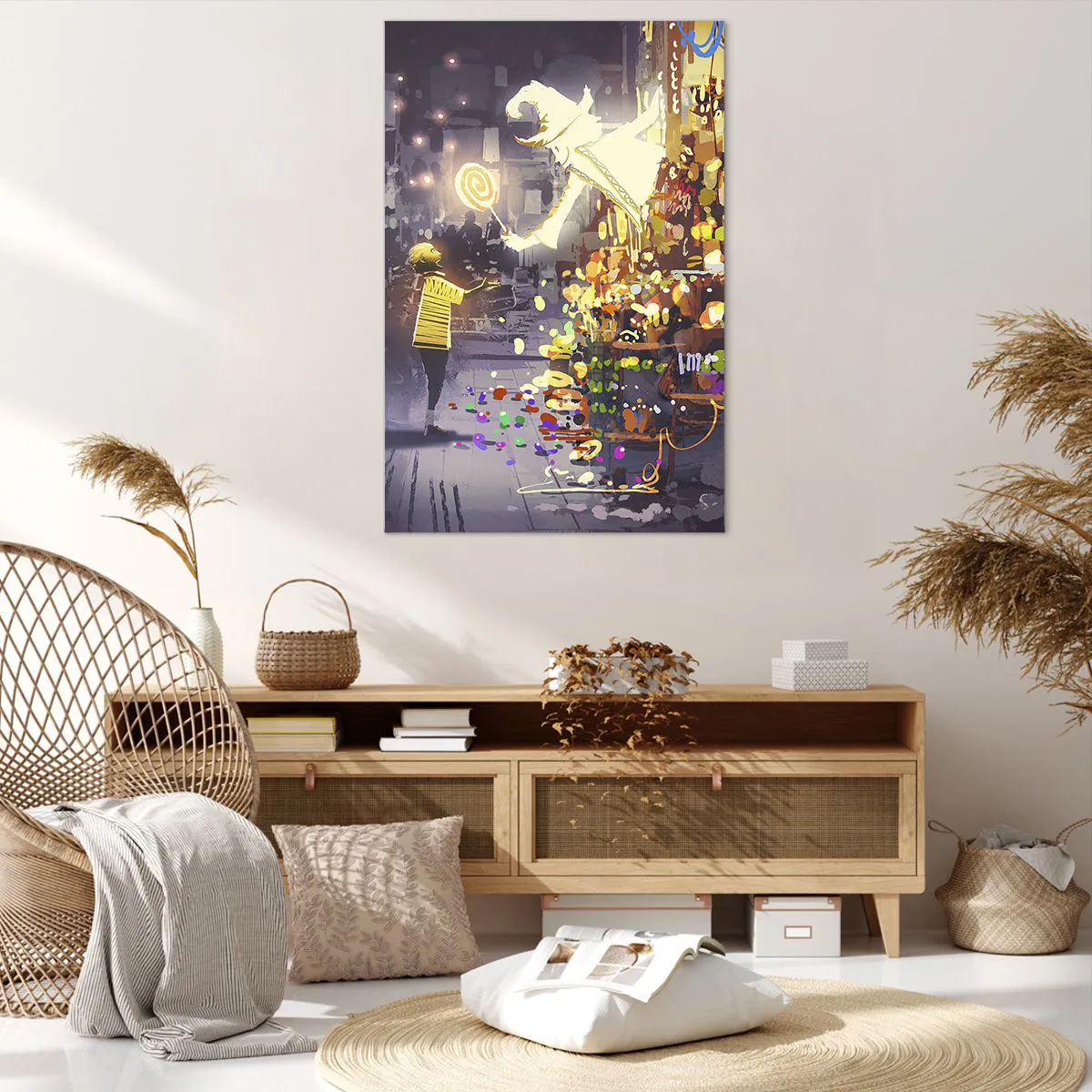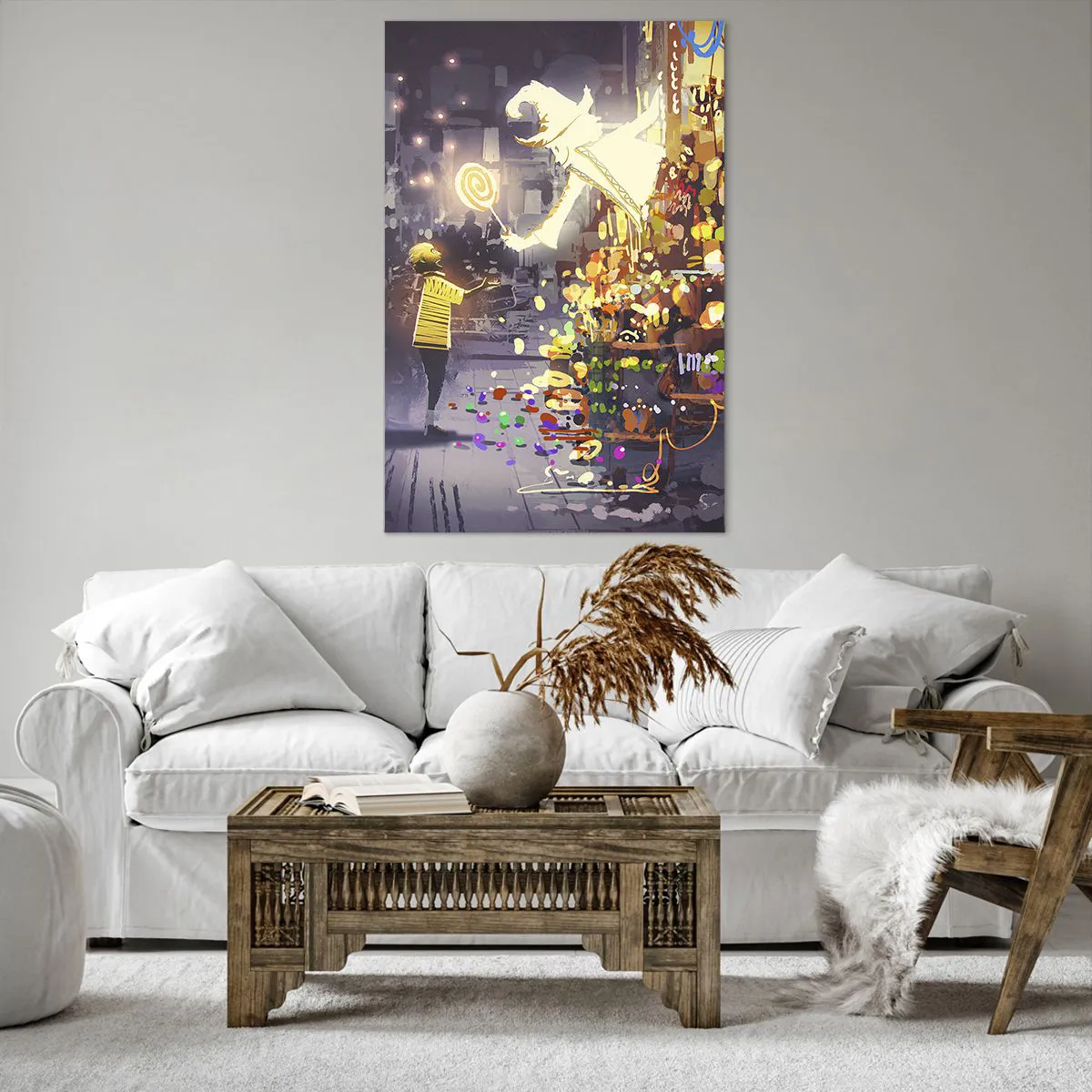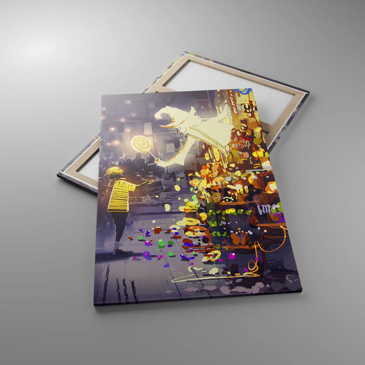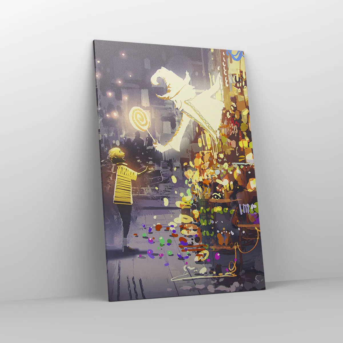 Impression sur toile - Image sur toile - Un personnage de conte de fées et un enfant dans une rue pleine de lumières et de magie - 80x120cm - La magie existe - Décoration murale moderne pour le salon et la chambre ARTTOR