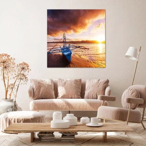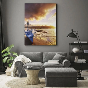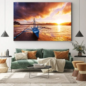 Impression sur toile - Image sur toile - Bateau bleu sur la plage au coucher du soleil - 80x120cm - Allongez-vous dans le sable après une longue journée - Décoration murale moderne pour le salon et la chambre ARTTOR