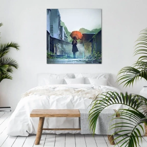 Impression sur toile - Image sur toile - Une silhouette avec un parapluie dans une ville pluvieuse - 80x120cm - Pluie vivifiante - Décoration murale moderne pour le salon et la chambre ARTTOR
