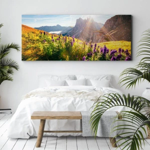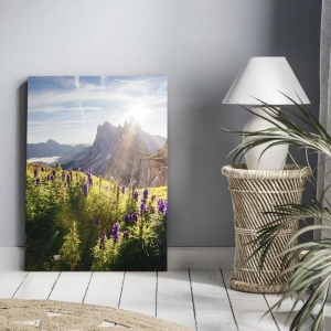 Impression sur toile - Image sur toile - Paysage de montagne avec des fleurs à la lumière du soleil levant - 70x100cm - La vie secrète des herbes - Décoration murale moderne pour le salon et la chambre ARTTOR