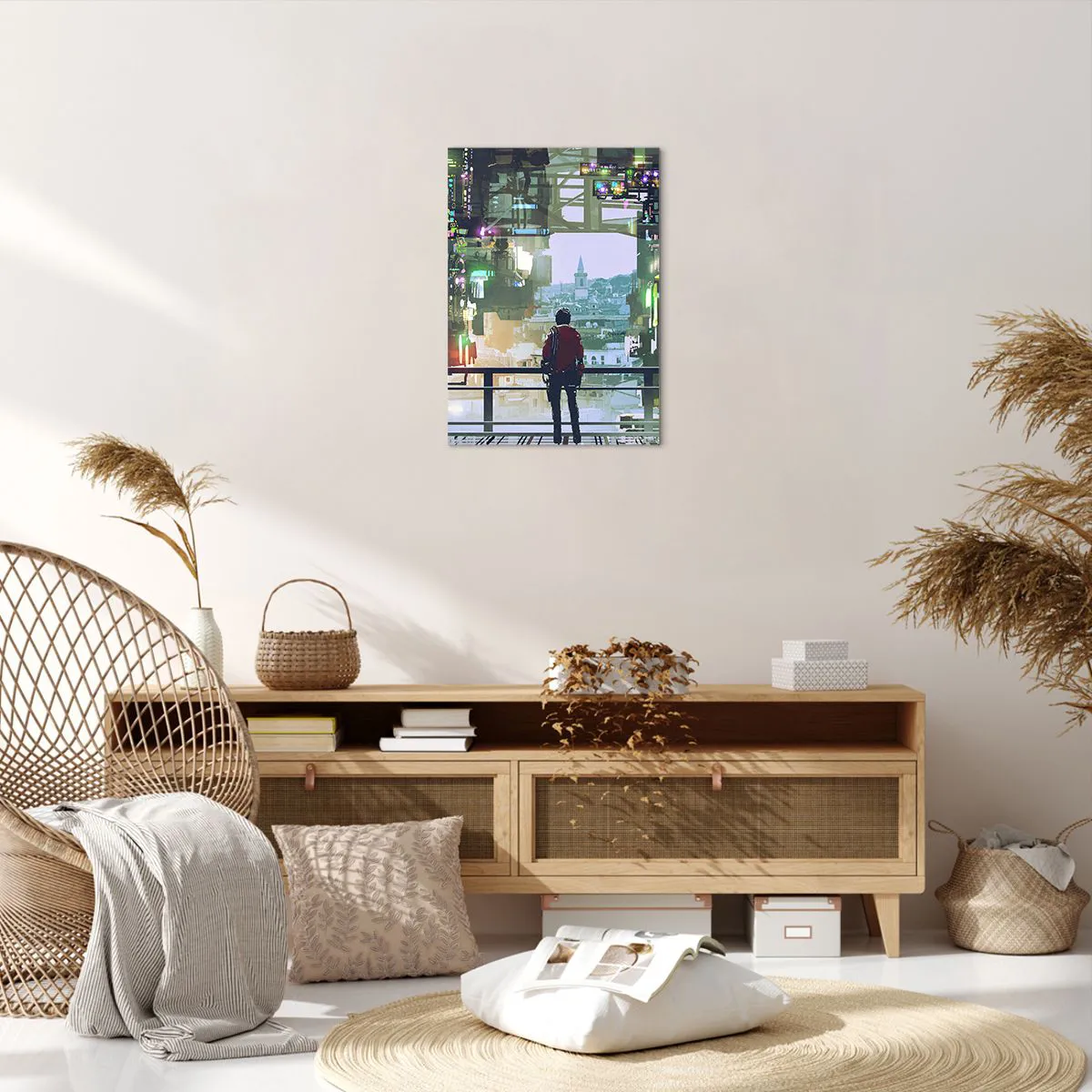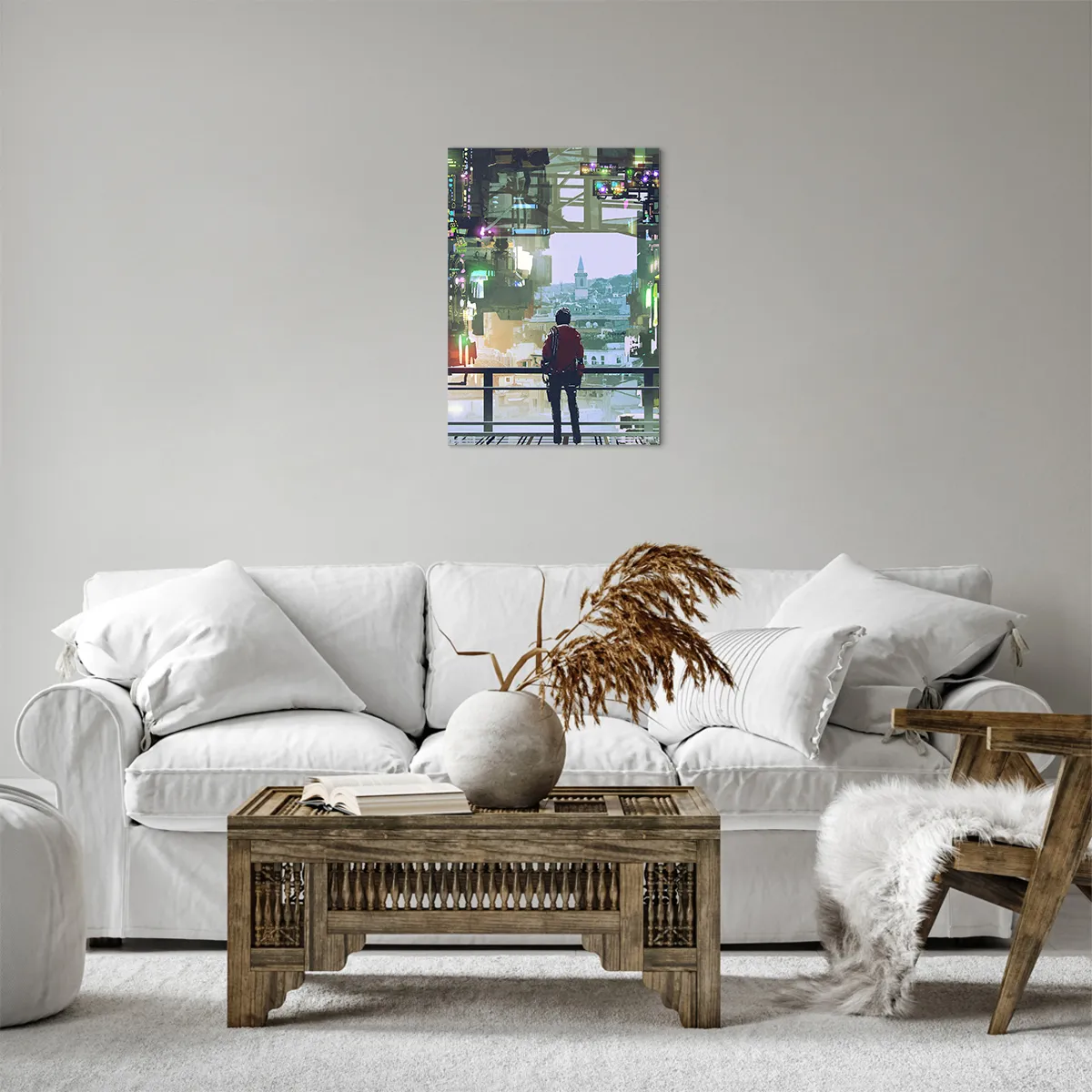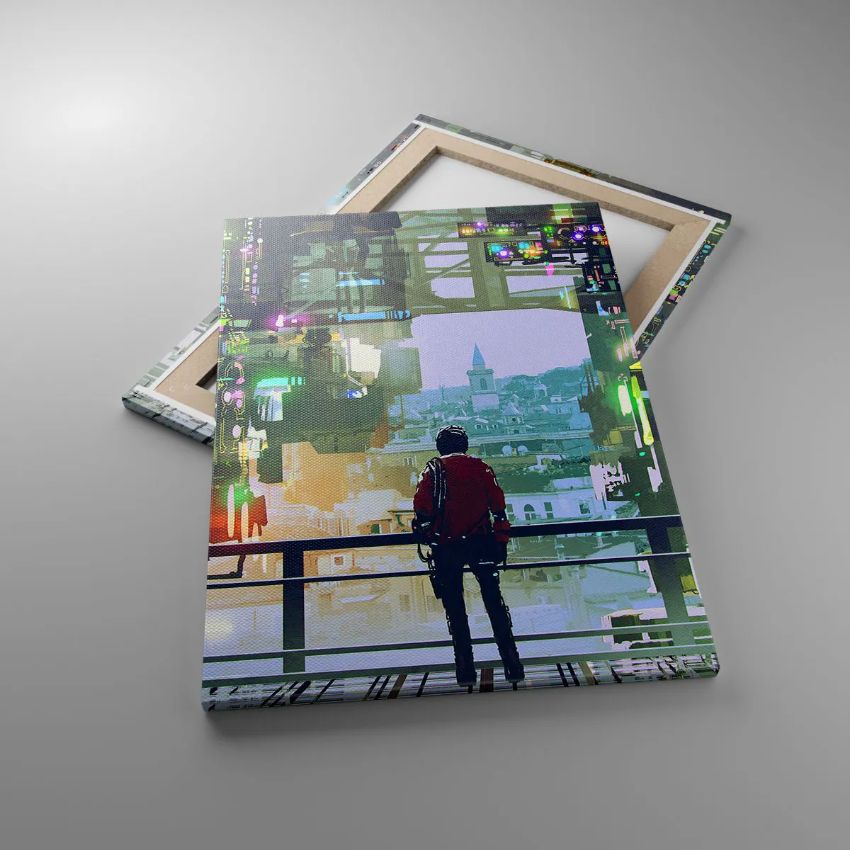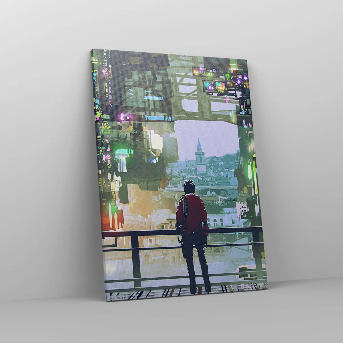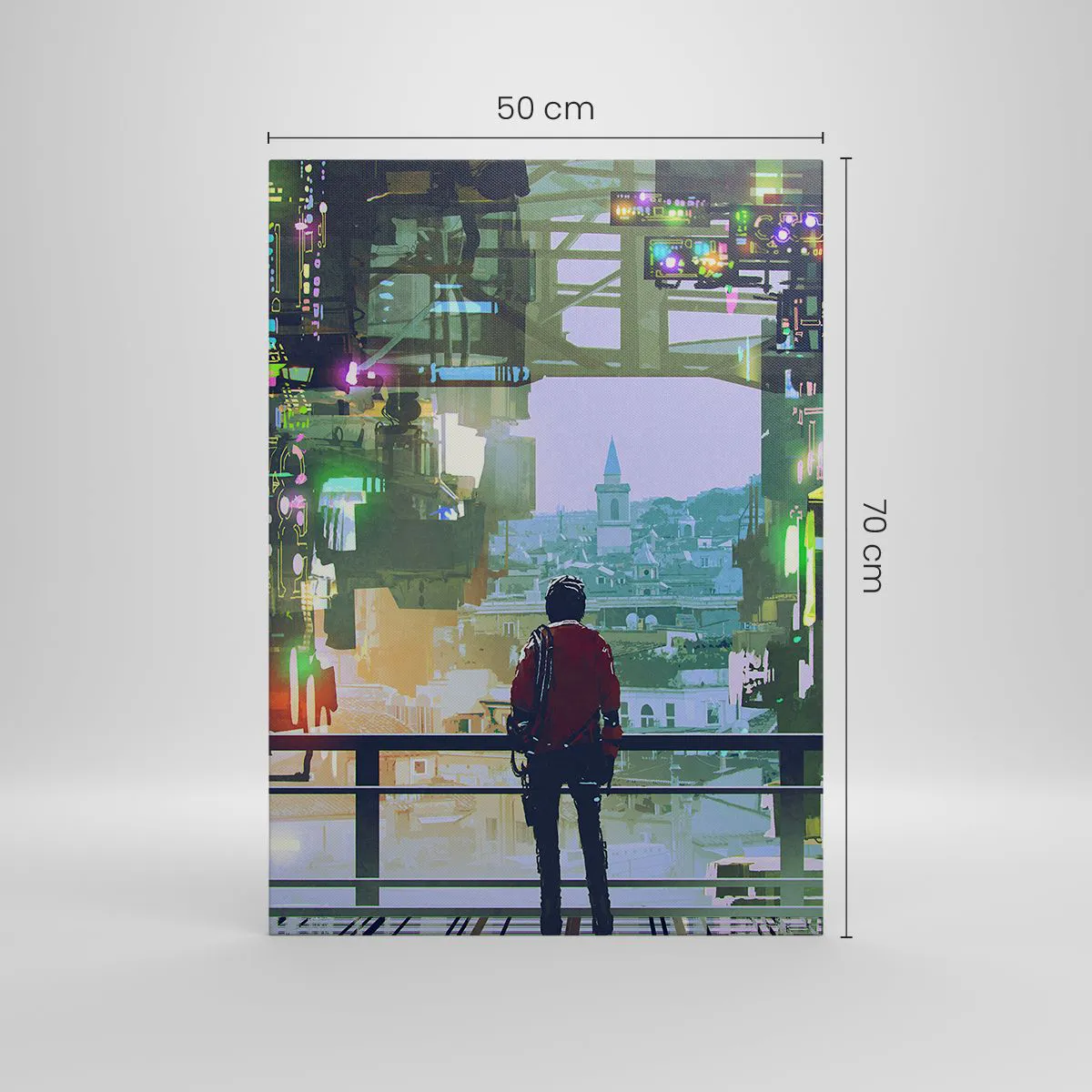 Impression sur toile - Image sur toile - Une silhouette dans une ville futuriste avec des néons - 50x70cm - Deux mondes - Décoration murale moderne pour le salon et la chambre ARTTOR