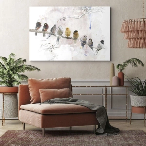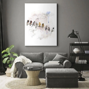 Impression sur toile - Image sur toile - Oiseaux colorés sur une branche dans un style aquarelle - 50x70cm - Rencontre ailée - Décoration murale moderne pour le salon et la chambre ARTTOR