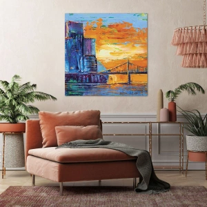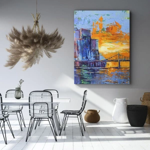 Impression sur toile - Image sur toile - Une ville colorée avec un pont au soleil couchant - 80x120cm - Culture et nature - Décoration murale moderne pour le salon et la chambre ARTTOR