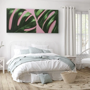 Impression sur toile - Image sur toile - Feuilles de monstera vertes sur fond rose - 50x70cm - Rendez-vous vert - Décoration murale moderne pour le salon et la chambre ARTTOR
