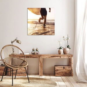 Impression sur toile - Image sur toile - Un surfeur court le long de la plage avec sa planche au soleil. - 80x120cm - A la rencontre des vagues - Décoration murale moderne pour le salon et la chambre ARTTOR