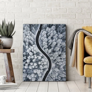 Impression sur toile - Image sur toile - Vue aérienne d'une route sinueuse dans une forêt hivernale - 80x120cm - À travers une forêt d'hiver - Décoration murale moderne pour le salon et la chambre ARTTOR