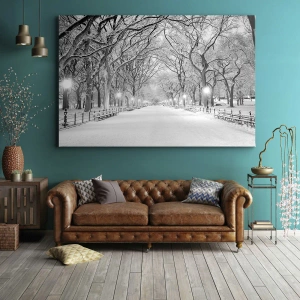- Ce tableau représente une allée hivernale entourée d'arbres enneigés, capturée dans un style monochrome. Parfait pour les intérieurs classiques et minimalistes, il apporte une sensation de tranquillité et d'élégance.