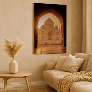 Le Taj Mahal, symbole de l'amour, séduit par sa monumentalité et la finesse de son exécution. Le tableau révèle les détails de la façade en marbre et des ornements, témoignant du savoir-faire des artisans anciens. La prise de vue à travers la porte accentue encore davantage le contraste d'ombre et de lumière, créant un effet spatial pittoresque.