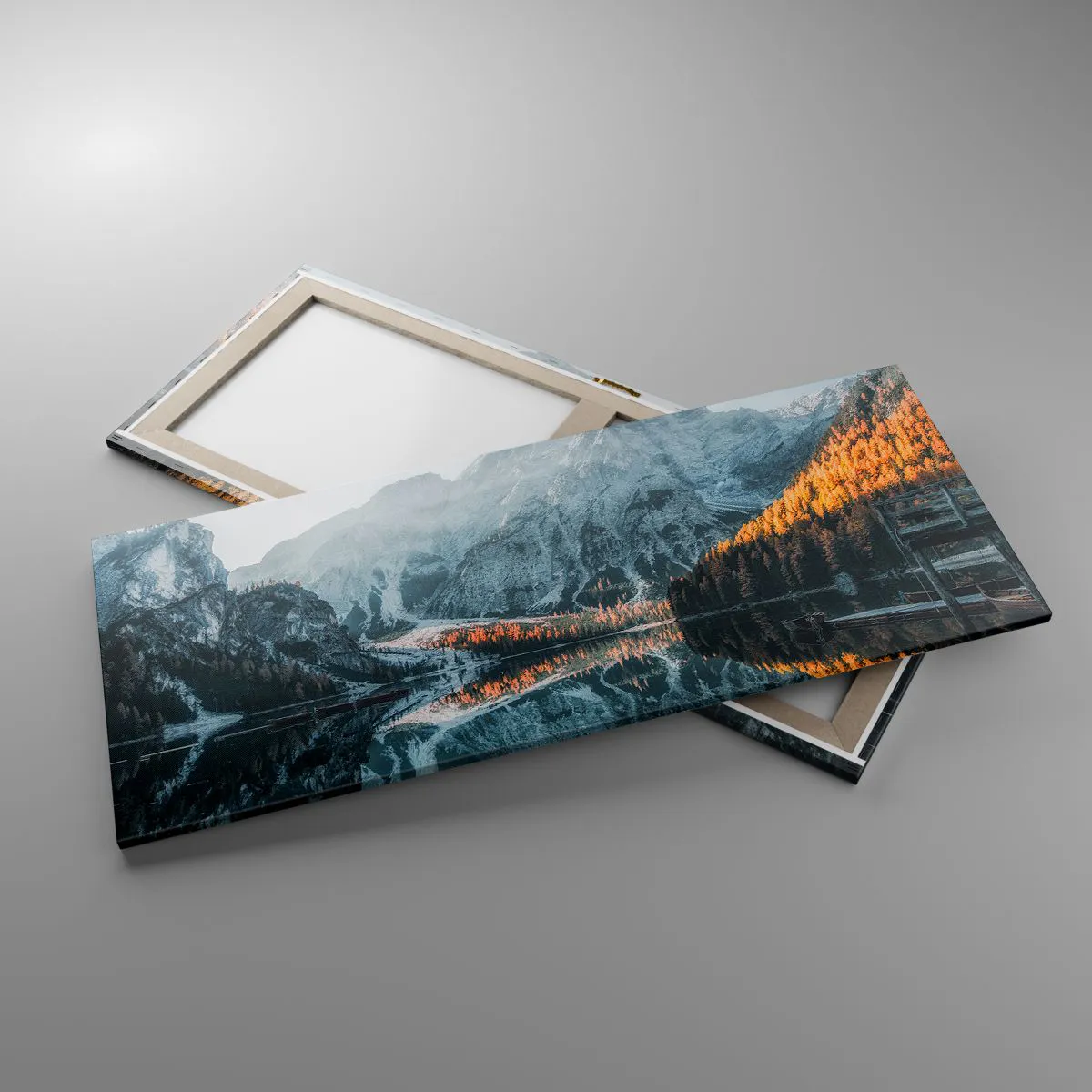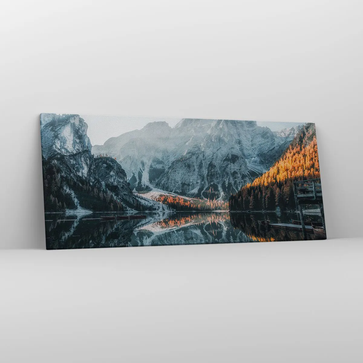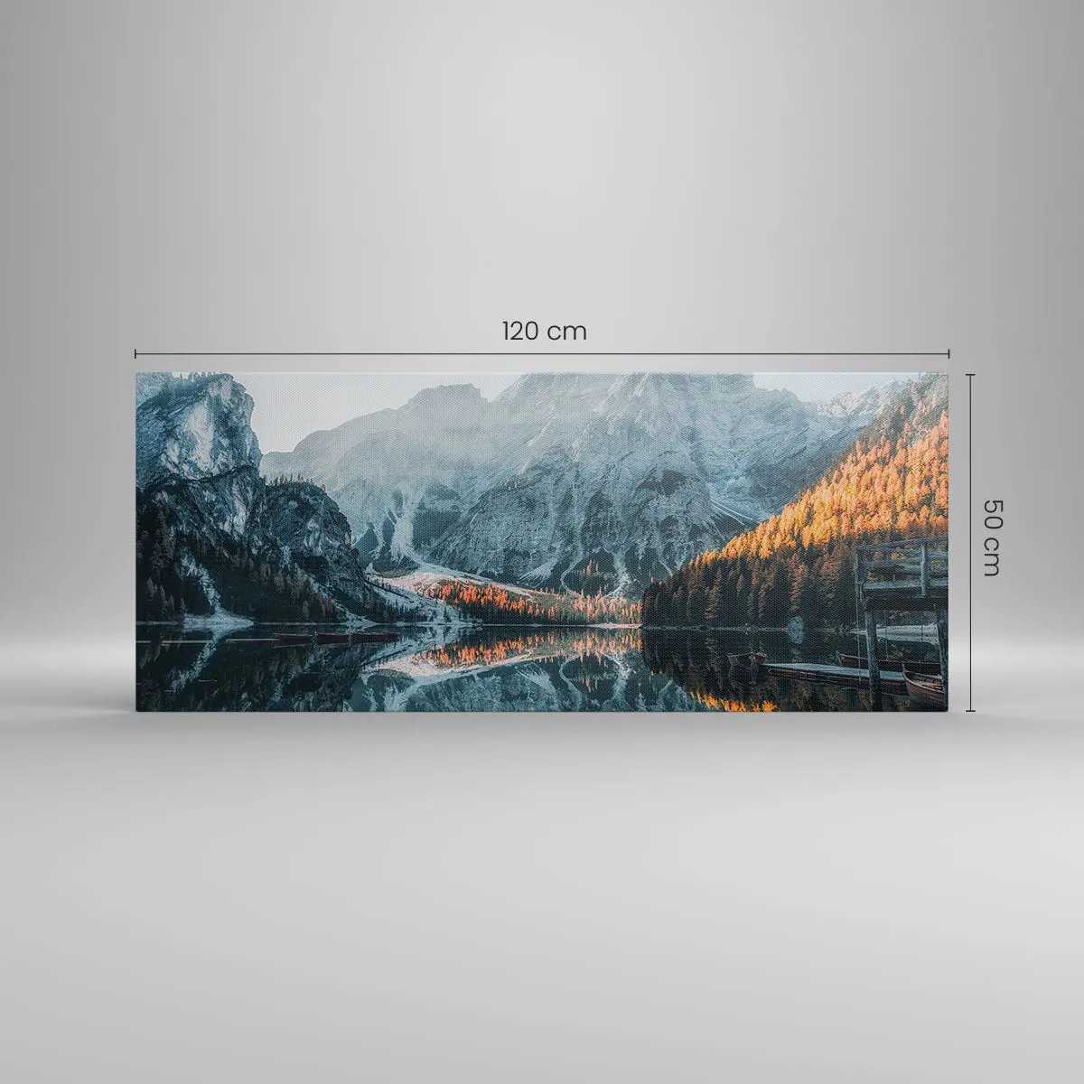 Impression sur toile - Image sur toile - Un paysage de montagne se reflétant dans la surface calme d'un lac - 120x50cm - Reflet de paysage - Décoration murale moderne pour le salon et la chambre ARTTOR
