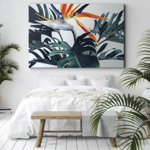Impression sur toile - Image sur toile - Fleur de Strelitzia entourée de feuilles sous une lumière vive - 160x50cm - Le buisson oiseaux - Décoration murale moderne pour le salon et la chambre ARTTOR