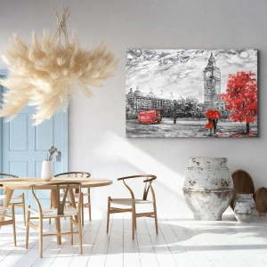 Impression sur toile - Image sur toile - Vue emblématique de Londres avec Big Ben, un bus rouge et un parapluie - 100x70cm - Une journée passionnante - Décoration murale moderne pour le salon et la chambre ARTTOR