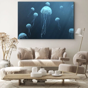 Impression sur toile - Image sur toile - Méduses flottant dans les profondeurs de l'océan dans des tons bleus - 140x50cm - Danse océanique - Décoration murale moderne pour le salon et la chambre ARTTOR