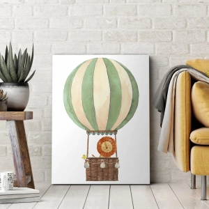 Impression sur toile - Image sur toile - Un ballon avec un lion souriant dans un panier aux couleurs pastel - 70x100cm - Les voyages de Léon - Décoration murale moderne pour le salon et la chambre ARTTOR