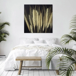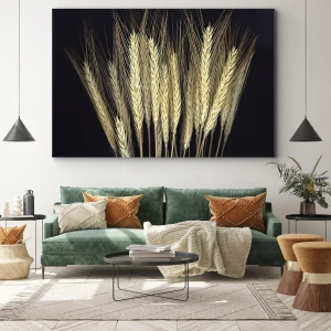 - Le tableau représente des épis de blé dorés sur un fond noir, créant une composition minimaliste et rustique parfaite pour les intérieurs de style campagnard.