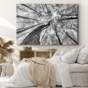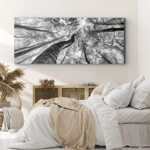 Impression sur toile - Image sur toile - Perspective d'arbres dans une forêt vue d'en bas en nuances de gris - 120x50cm - Course vers la lumière - Décoration murale moderne pour le salon et la chambre ARTTOR