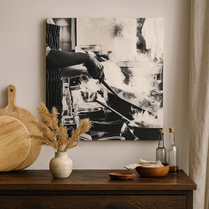 La composition se distingue par un style monochrome subtil qui confère à la scène élégance et expressivité. La vapeur s'échappant de la poêle ajoute du dynamisme et souligne la fugacité de l'instant, faisant de ce tableau un ajout idéal à une cuisine, un restaurant ou un bureau qui privilégie le style et l'expression artistique.