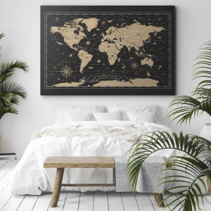 Impression sur toile - Image sur toile - Une carte du monde stylisée sur fond noir avec des accents beiges. - 80x120cm - Les limites de mon monde - Décoration murale moderne pour le salon et la chambre ARTTOR