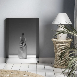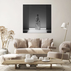 Impression sur toile - Image sur toile - Une peinture en noir et blanc avec une scène minimaliste d'une femme dans un espace géométrique. - 50x70cm - Simplicité raffinée - Décoration murale moderne pour le salon et la chambre ARTTOR