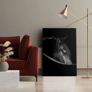 Impression sur toile - Image sur toile - Portrait en noir et blanc d'un cheval avec un jeu subtil de lumière et d'ombre sur un fond sombre. - 50x70cm - Prince Noir - Décoration murale moderne pour le salon et la chambre ARTTOR