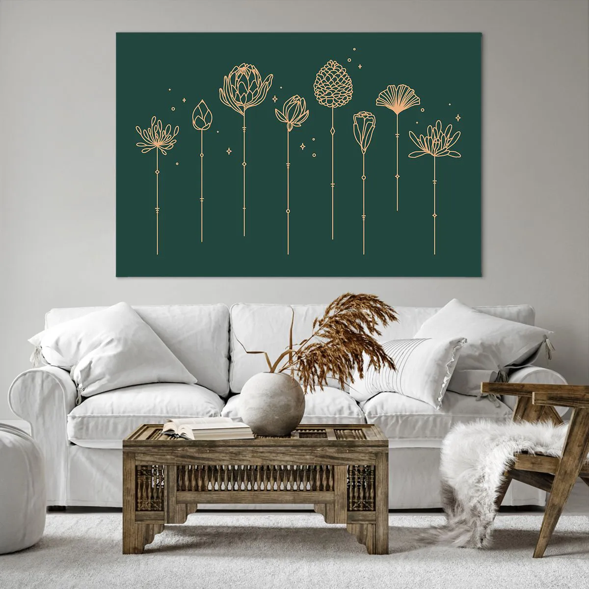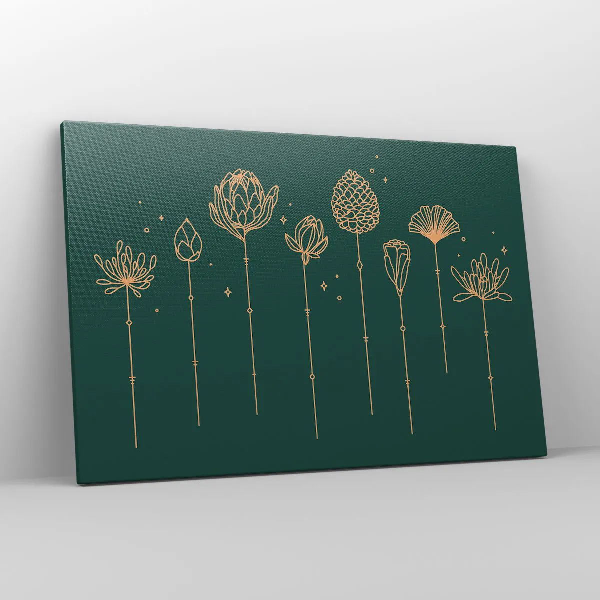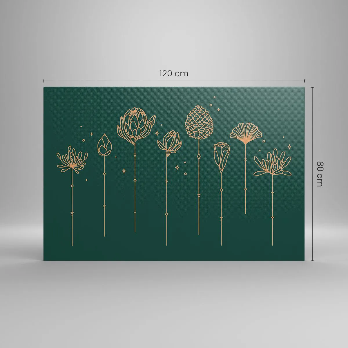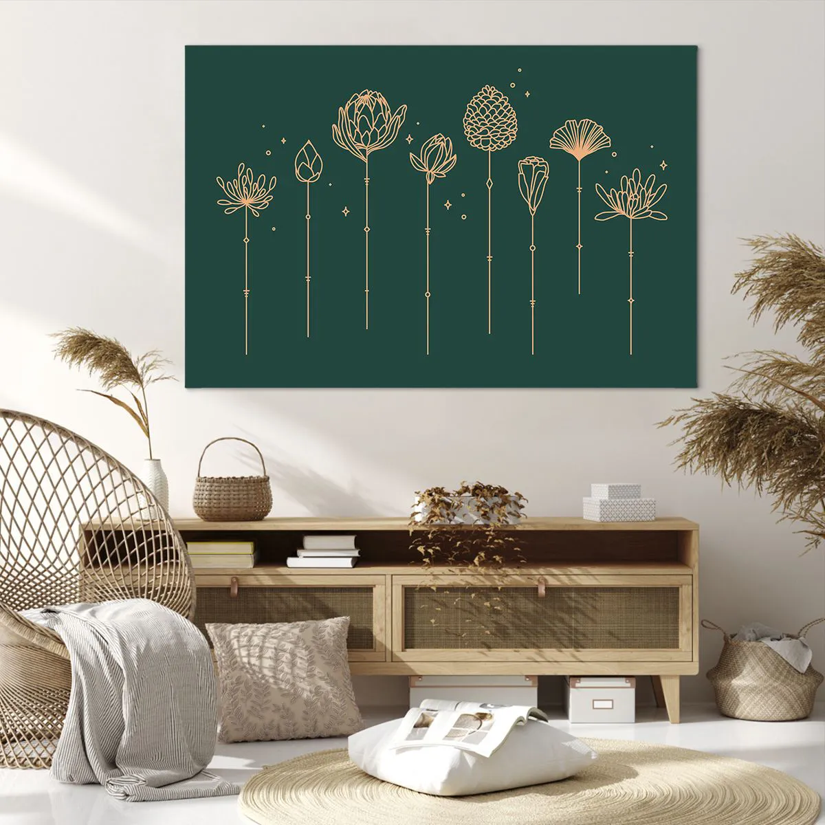 Impression sur toile - Image sur toile - Dessins dorés d'herbes sur fond vert foncé - 120x80cm - La famille Plante - Décoration murale moderne pour le salon et la chambre ARTTOR