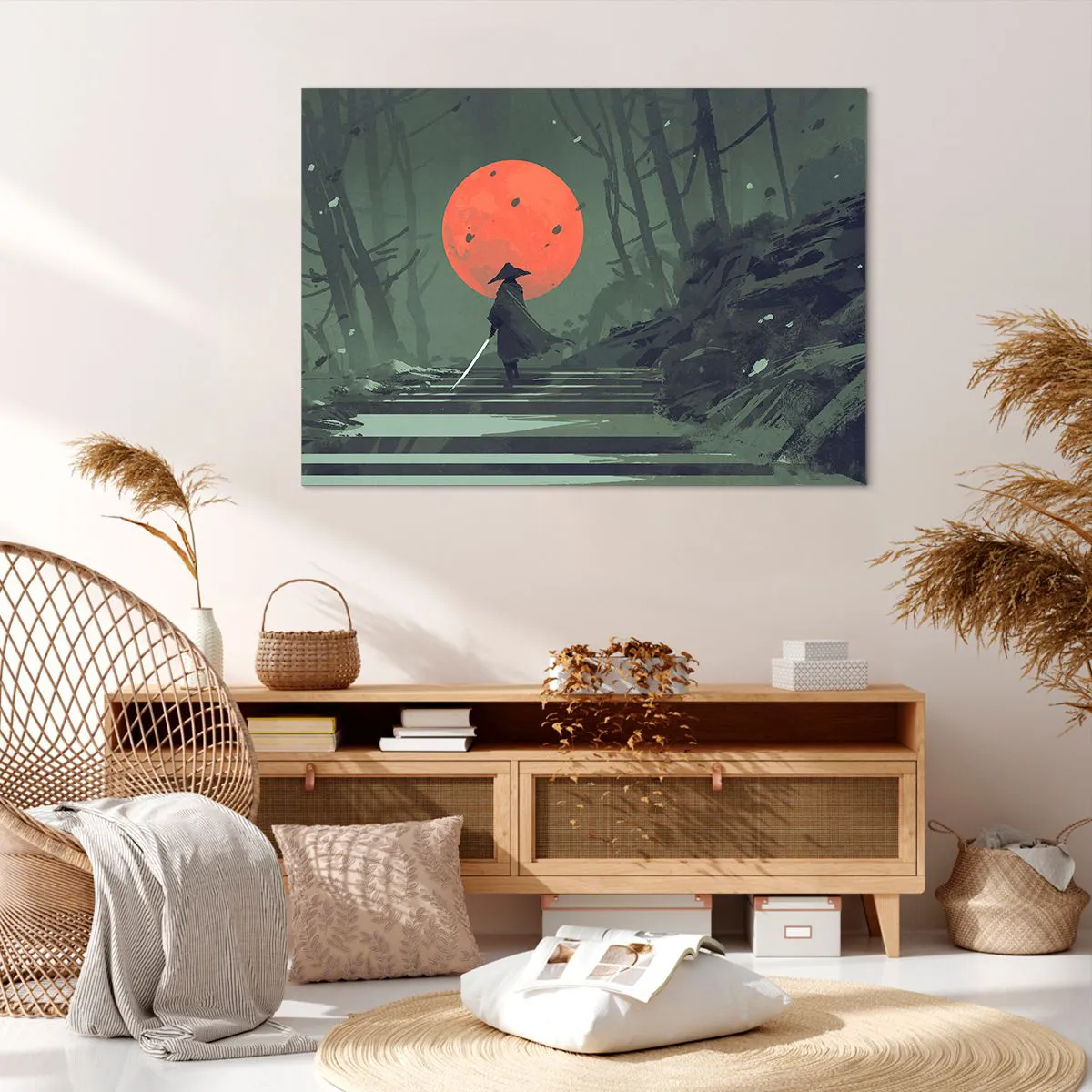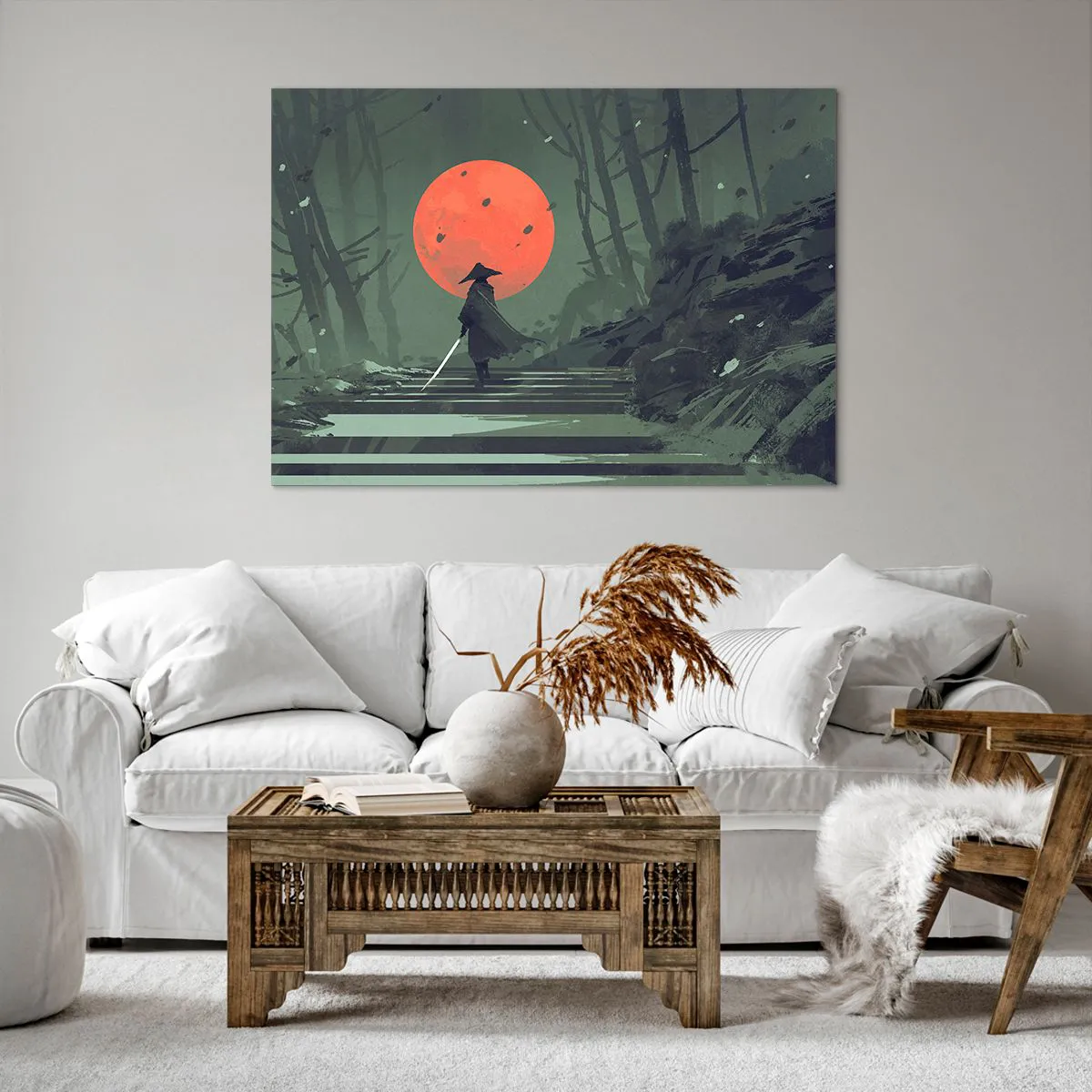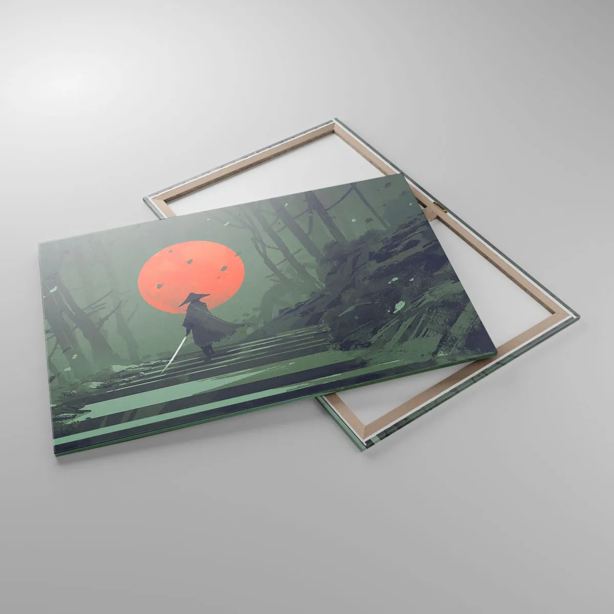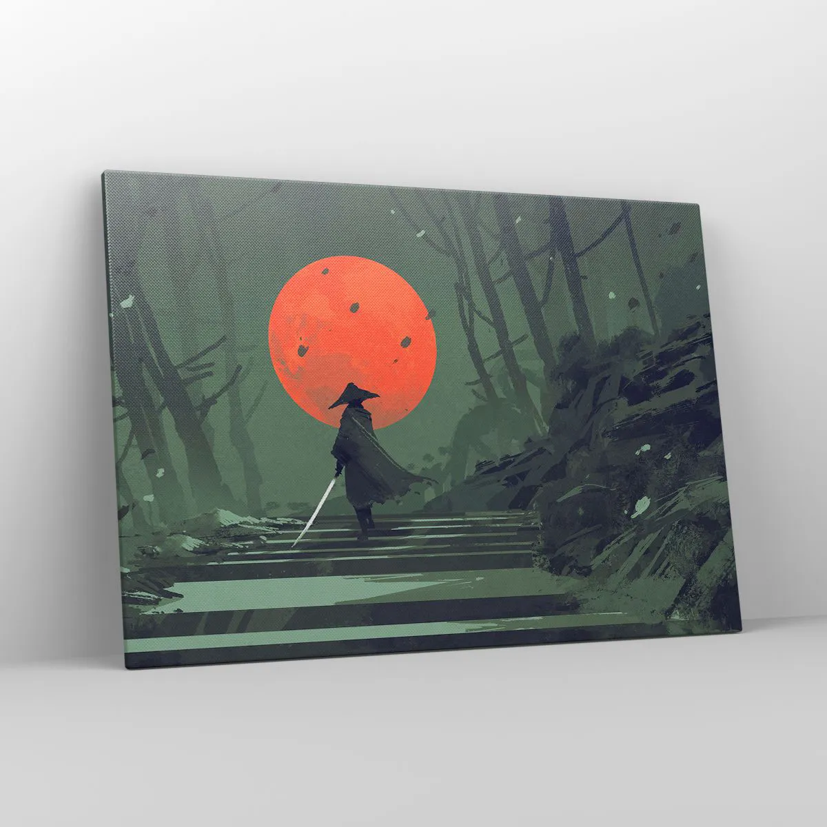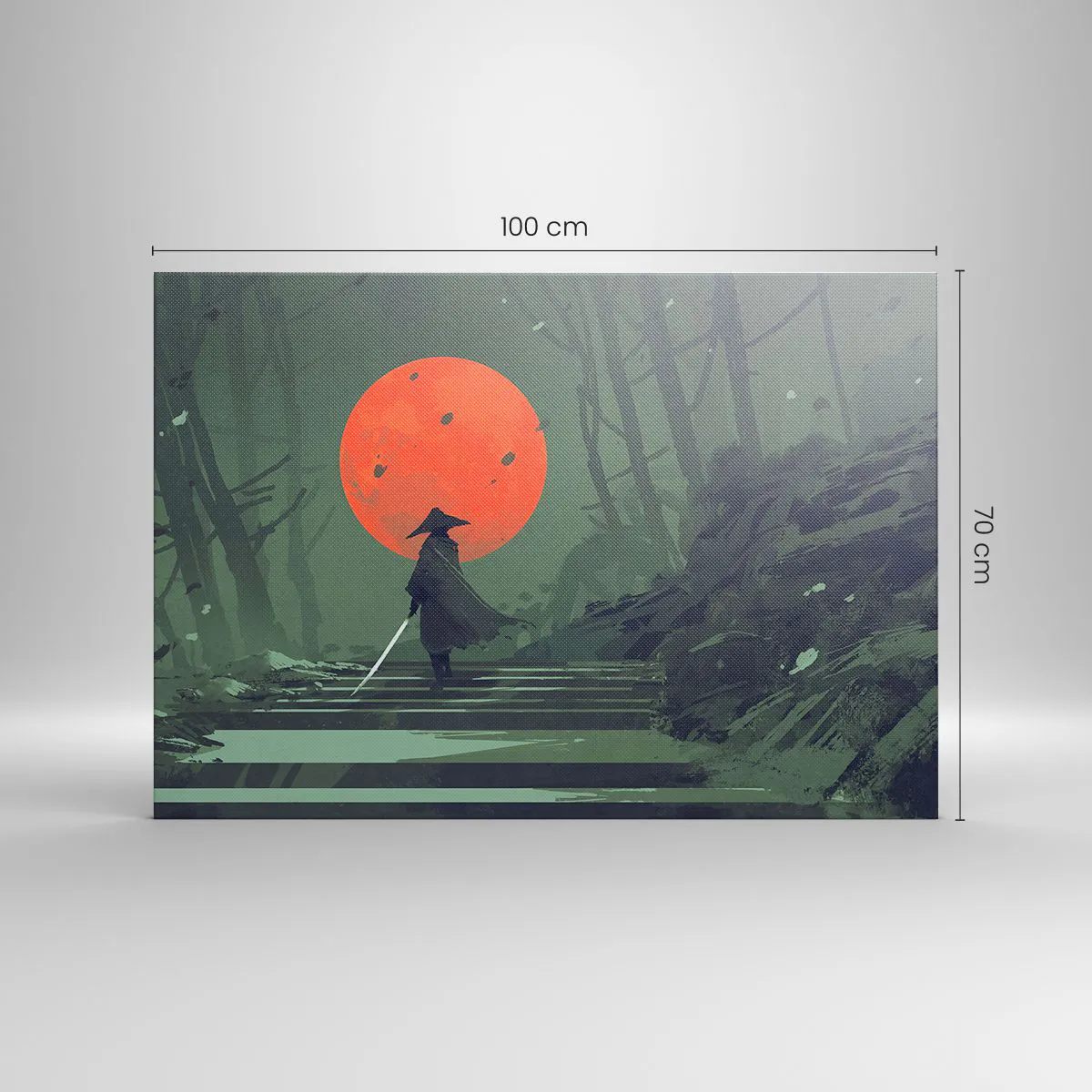 Impression sur toile - Image sur toile - Un guerrier solitaire avec une épée sur fond de lune rouge dans une forêt sombre. - 100x70cm - Guerrier de la lune rouge - Décoration murale moderne pour le salon et la chambre ARTTOR