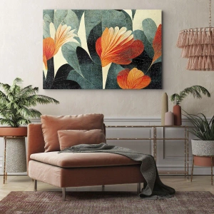 - Ce tableau représente des fleurs aux nuances vibrantes d'orange et de vert, sur fond de motifs naturels. Une décoration saisissante et élégante, parfaite pour les intérieurs modernes tels que les salons, les chambres ou les bureaux.