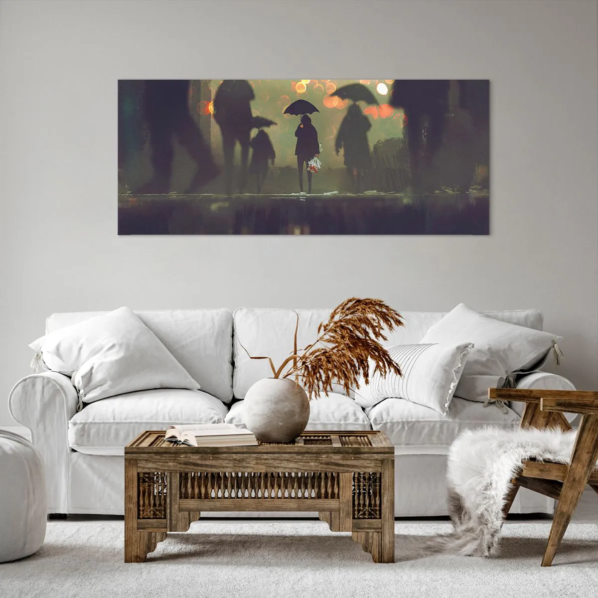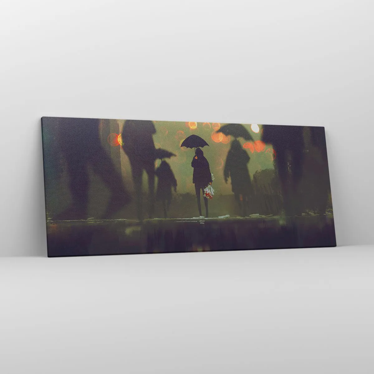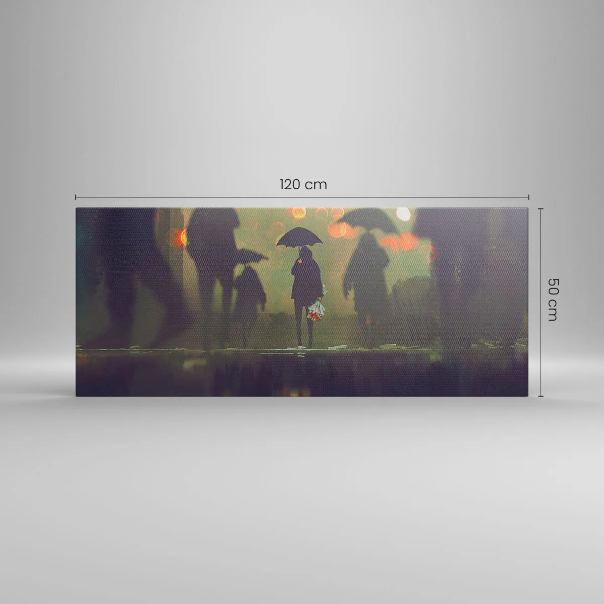 Impression sur toile - Image sur toile - Une silhouette avec un parapluie un soir pluvieux parmi les lumières de la ville - 120x50cm - Du point de vue d'une goutte de pluie - Décoration murale moderne pour le salon et la chambre ARTTOR