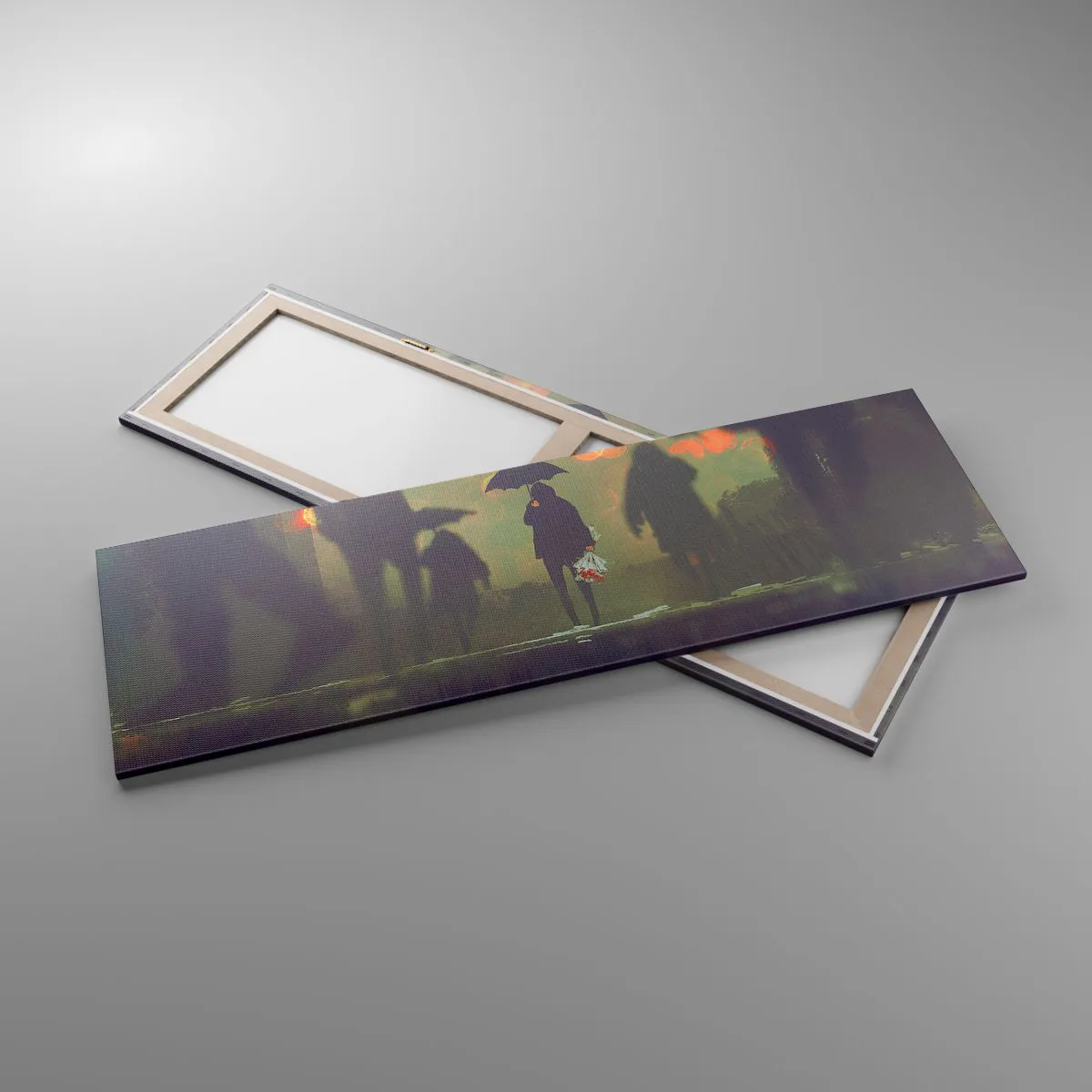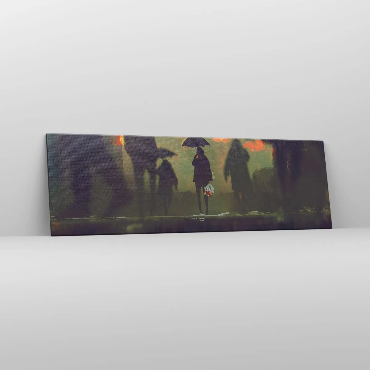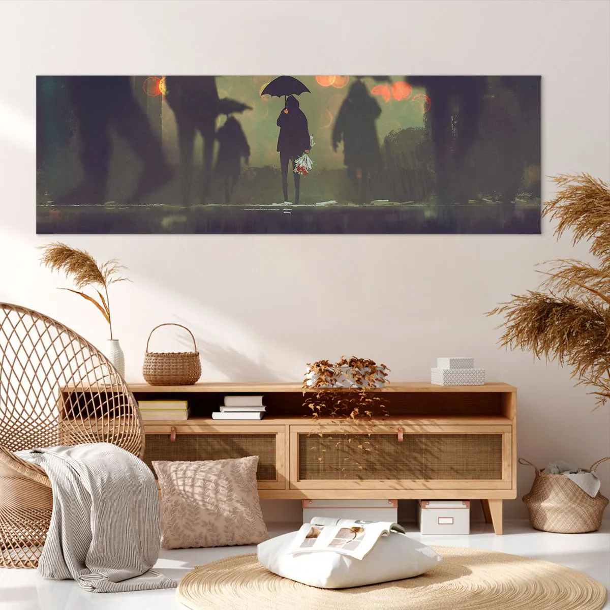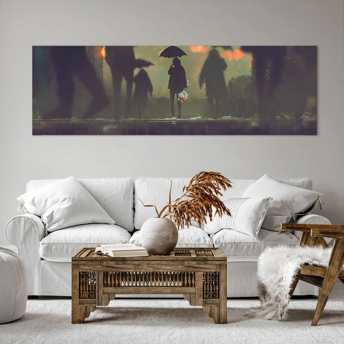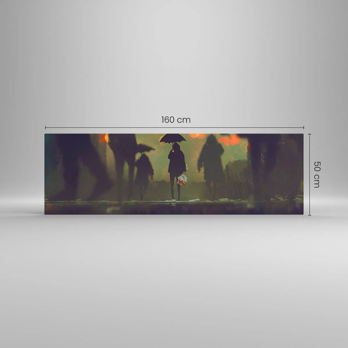Impression sur toile - Image sur toile - Une silhouette avec un parapluie un soir pluvieux parmi les lumières de la ville - 160x50cm - Du point de vue d'une goutte de pluie - Décoration murale moderne pour le salon et la chambre ARTTOR