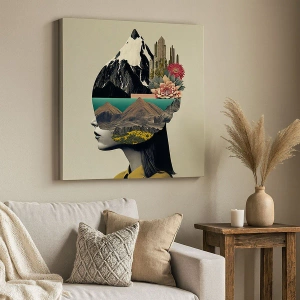Impression sur toile - Image sur toile - Collage d'une femme avec un paysage de montagne et des fleurs - 120x80cm - La femme – toujours un mystère - Décoration murale moderne pour le salon et la chambre ARTTOR