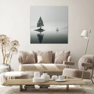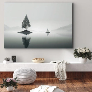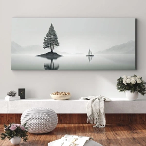 Impression sur toile - Image sur toile - Un paysage minimaliste avec un arbre sur une île et un voilier. - 160x50cm - Un rêve somnolent - Décoration murale moderne pour le salon et la chambre ARTTOR