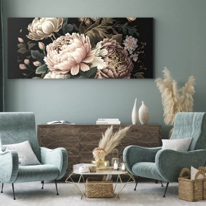 Grâce à ses dimensions 70 x 50 cm, ce tableau peut devenir un point focal sur le mur, attirant l'attention et créant une atmosphère de détente et de beauté naturelle. L'association de couleurs florales subtiles et d'un fond noir contrastant confère à la composition profondeur et caractère unique.