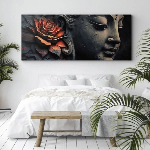 Impression sur toile - Image sur toile - Sculpture de Bouddha avec une fleur de lotus rouge - 50x70cm - En harmonie avec le monde - Décoration murale moderne pour le salon et la chambre ARTTOR