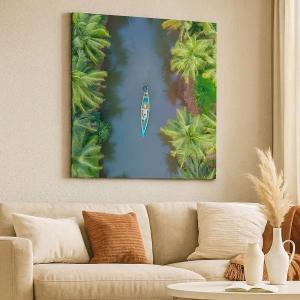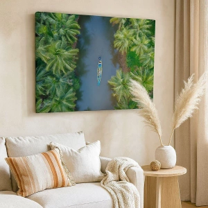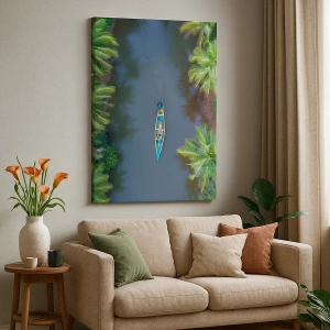 - Le tableau représente une rivière tropicale entourée de palmiers, avec un bateau flottant en son centre. La vue plongeante capture l'harmonie pittoresque de la nature, idéale pour les amateurs de paysages exotiques.